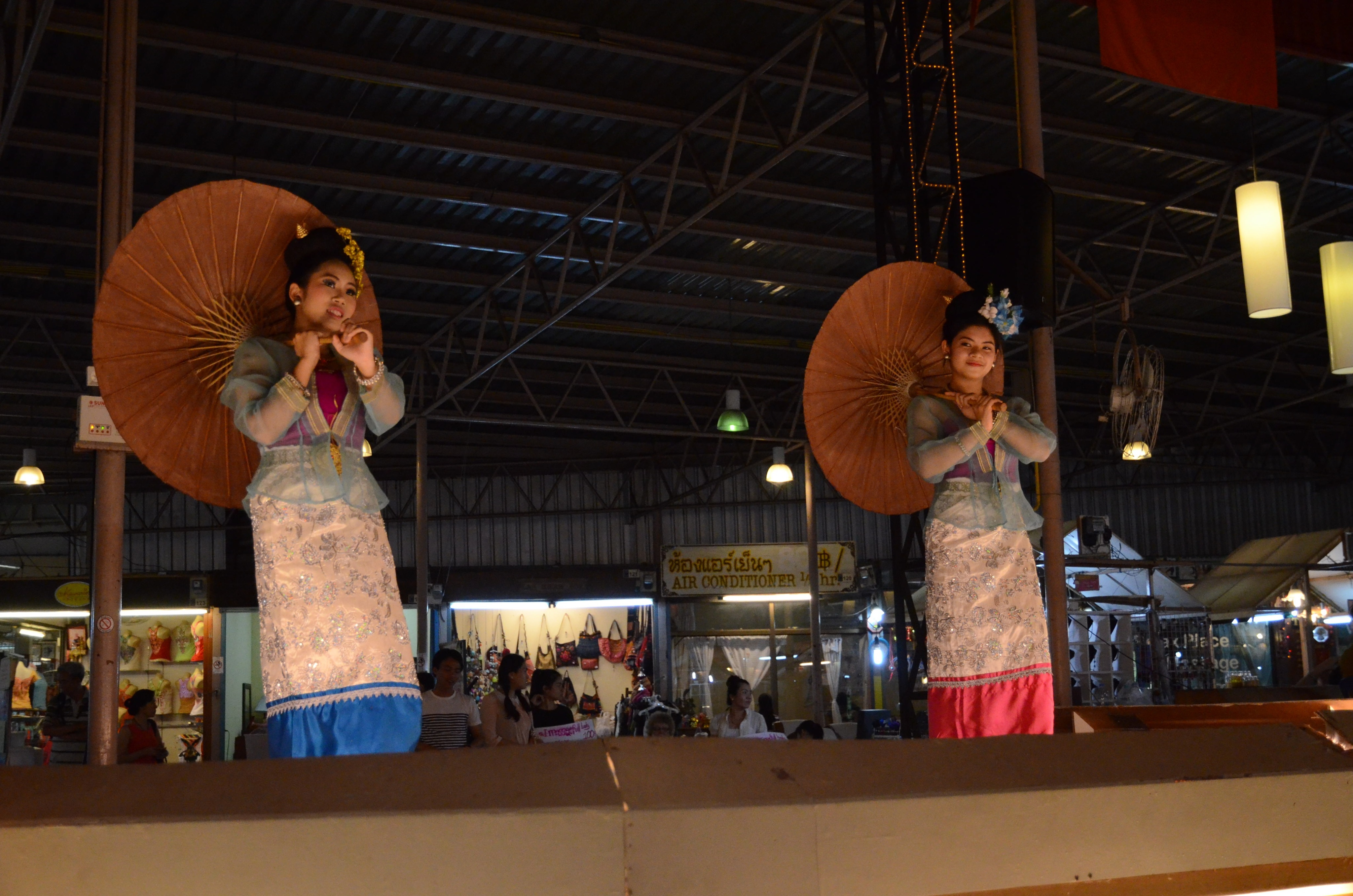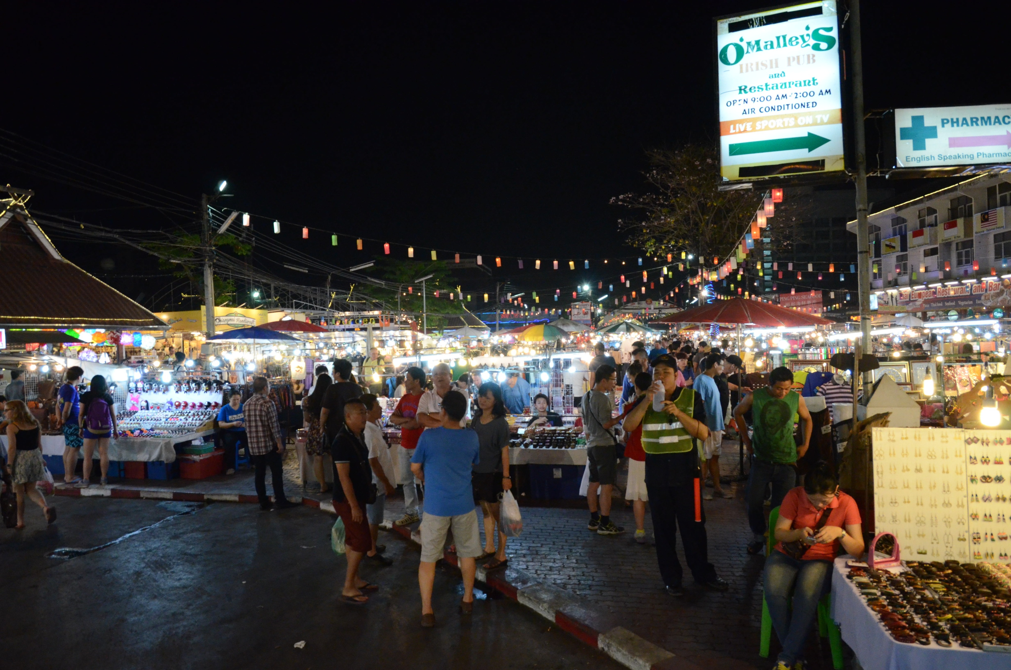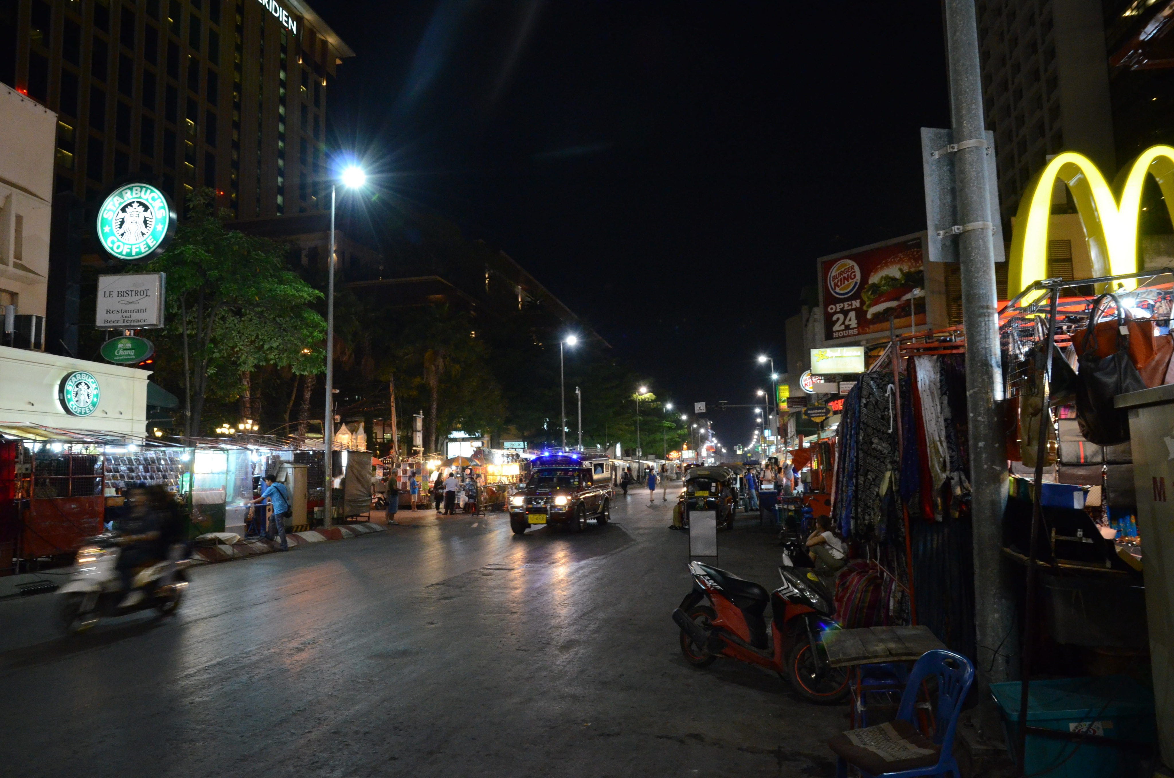 Po ubytování ihned vyrážíme na večeři, na místní každodenní noční trh. Sice je více zaměřený na turisty, ale v postranních uličkách se dá narazit i na stánky s všelijakým jídlem. Tuk tuk nás vysazuje u križovatky, kde na třech rozích ze čtyř lze nalézt Starbucks, McDonald a Burger King, tolik ke globalizaci 🙂 Hned v prvním stánku si kupujeme mango s lepivou rýží a kokosovým mlékem za 50 THB (asi 32 Kč) a pokračujeme v prozkoumávání bazaaru. Večeříme nakonec maso na špejlích (zase :)), sushi, ovocné šťávy určené prý pro lepší pleť a zažívání a shaky. Vše se nachází na jednom místě, kde si člověk vymění velké bankovky za lístky a ty pak používá k placení u stánků, aby prodejci nemuseli vracet drobné na tisícovky. Chytré řešení 🙂
