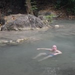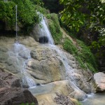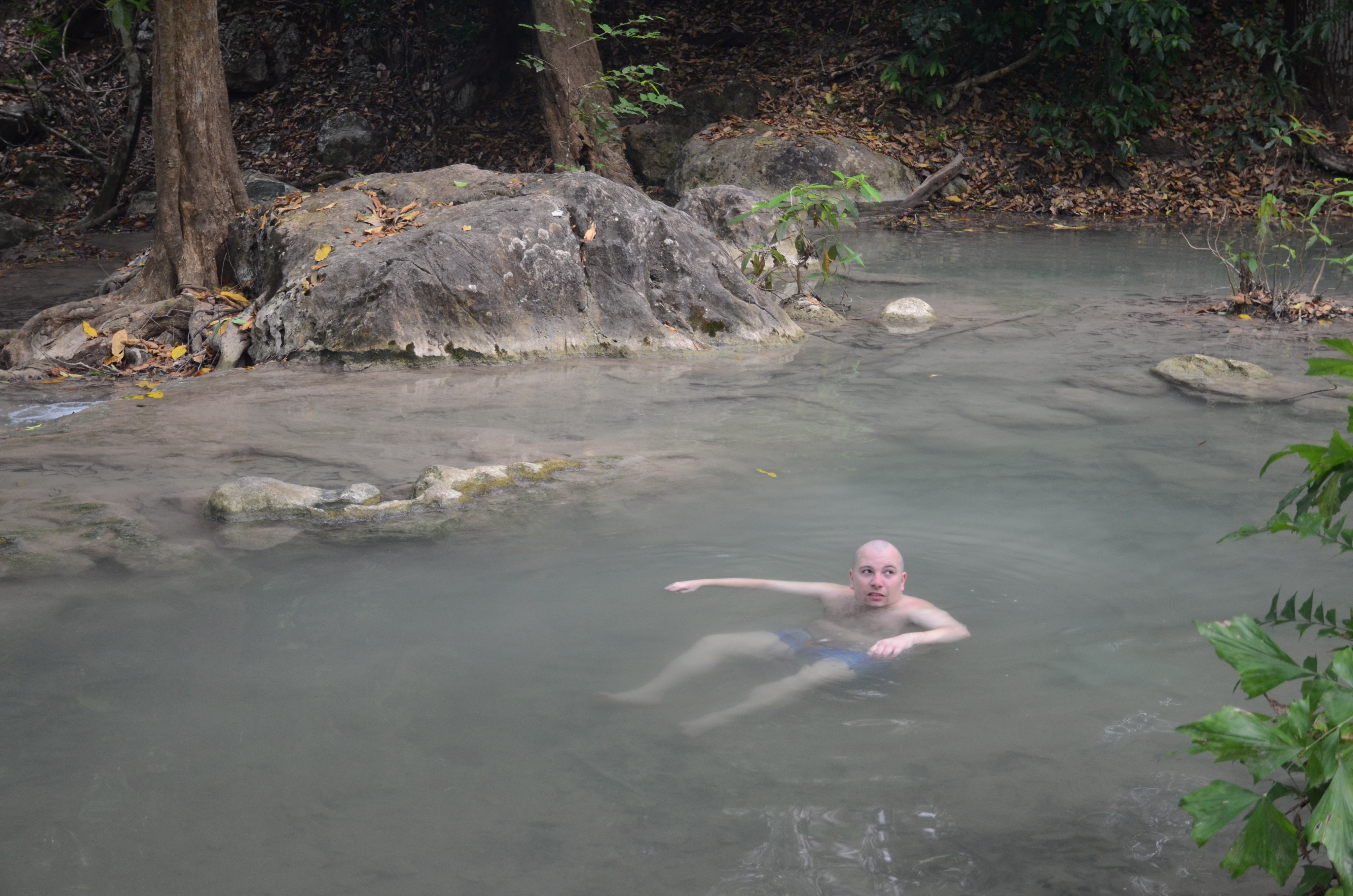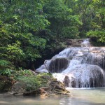 Cesta autem k vodopádům trvala přes dvě hodiny. Vymotat se z Bangkoku nějakou dobu zabere a cíl byl 130 km daleko. Počasí pěšímu výletu moc nepřálo, ale spousta lidí se jezdí k vodopádům koupat, a tak jsme vyrazili. Celý vodopád se skládá ze sedmi úrovní. Pína i s bolavou nohou vyrazil také. První čtyři úrovně vodopádů s jezírky byly obsypané lidmi, takže jsme si přírodních krás moc neužili. Dál už ale vedla delší cesta, a tak jsme se mohli kochat. Na 6. patro už nebyla cesta tak jednoduchá, lezlo se po skalách a vodou, takže Pína nakonec až nahoru nešel. Vyrazil pomalu zpátky dolů, zatímco já jsem se doplahočila až do posledního sedmého patra, a pak se také vydala nazpět za Pínou, který se dole vykoupal a koupil si tričko, protože košili měl skrz na skrz propocenou 🙂